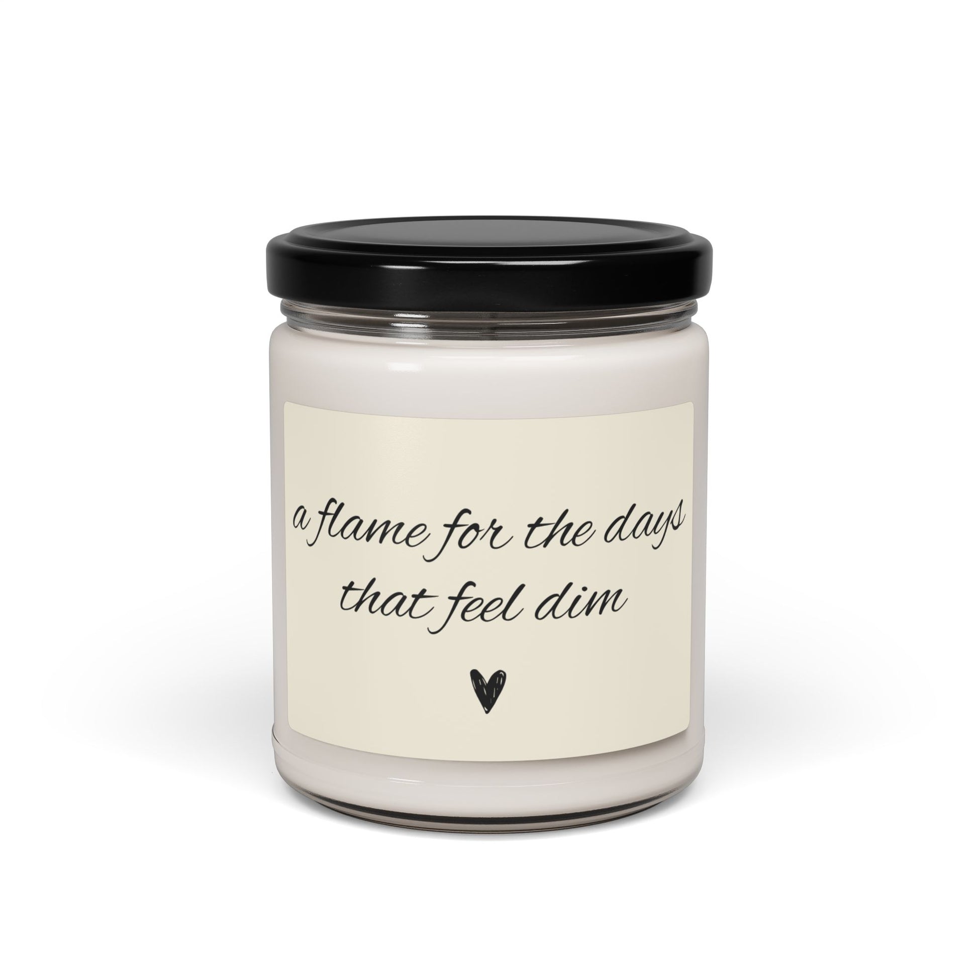 Scented soy candle that says 'a flame for the days that feel dim'. This eco-friendly and non-toxic candle comes in a reusable glass vessel and offers a variety of aromatic scents to create a cozy atmosphere in any space. Perfect for those seeking a comforting and relaxing ambiance, ideal for holidays and special occasions.