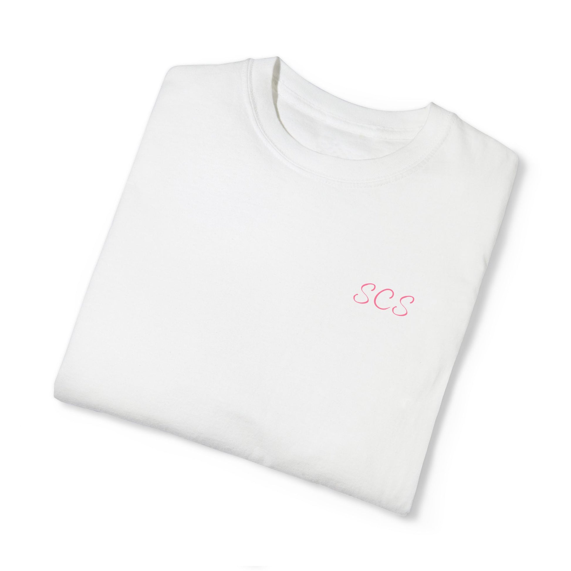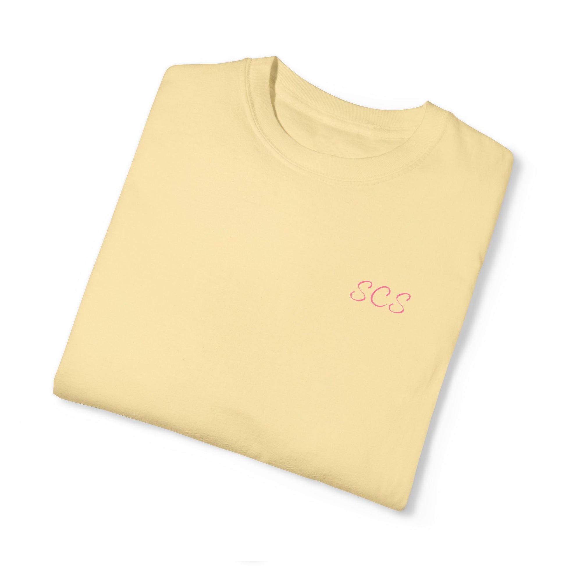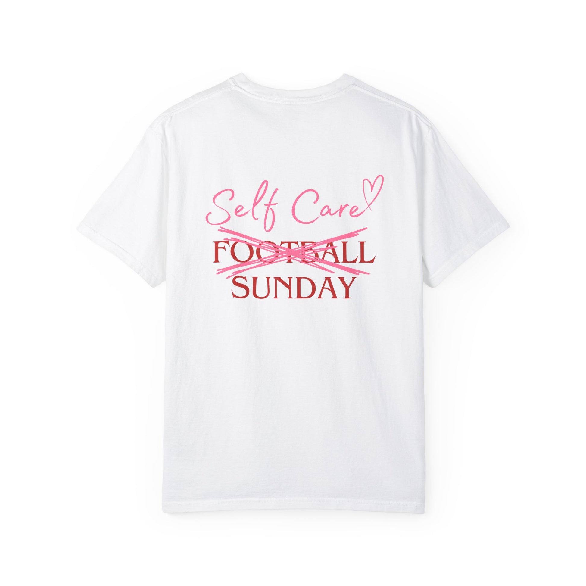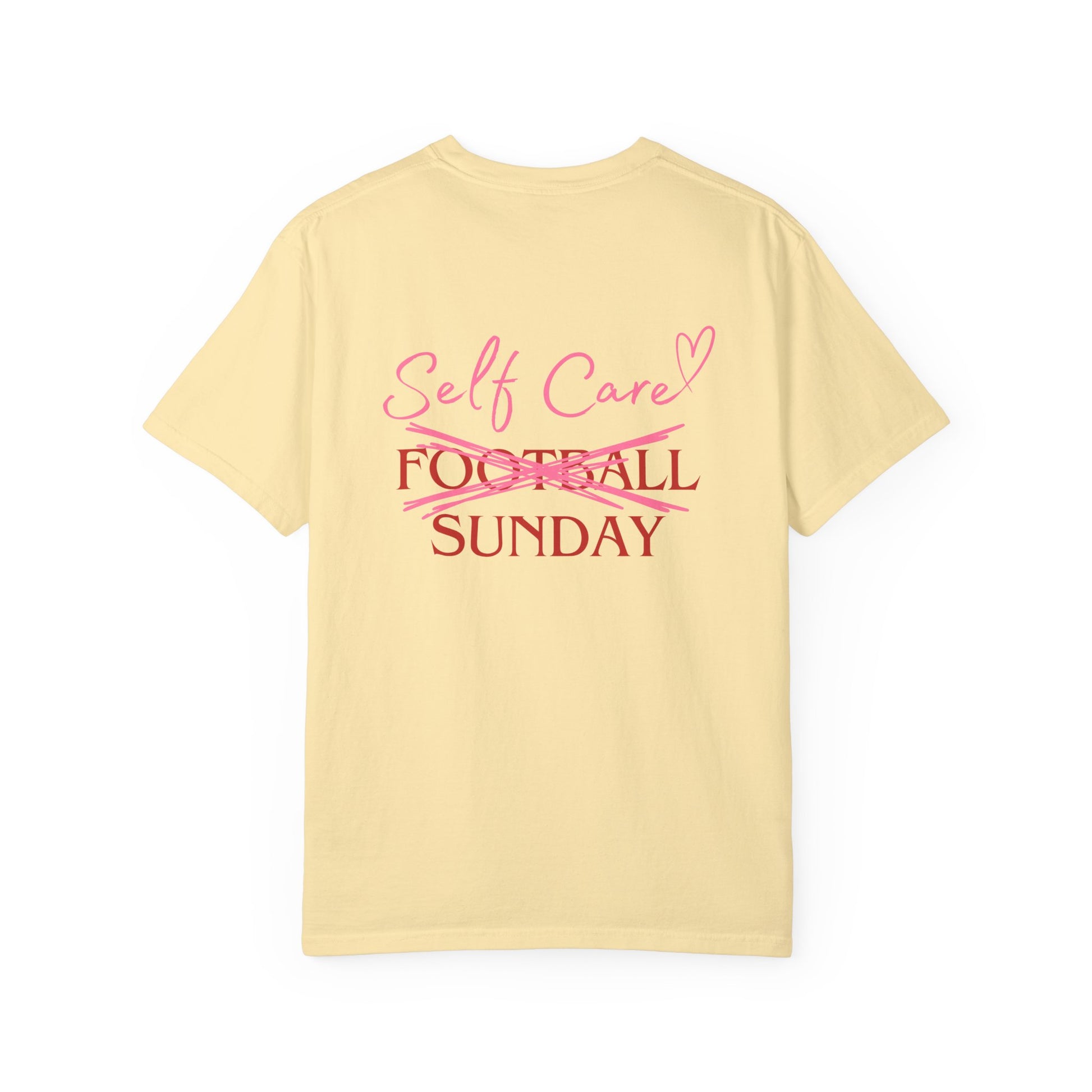 A comfortable and versatile unisex garment-dyed T-shirt perfect for self-care Sundays. The unique design features 'Football Sunday' with 'Football' scratched out to read 'Self Care Sunday', giving off a relaxed and cozy vibe. The front left has 'SCS' for Self Care Sunday in delicate handwriting. This T-shirt is ideal for adults looking for a soft, comfortable tee to wear while lounging at home or running errands. It is relevant for relaxation, self-care, and casual wear occasions.