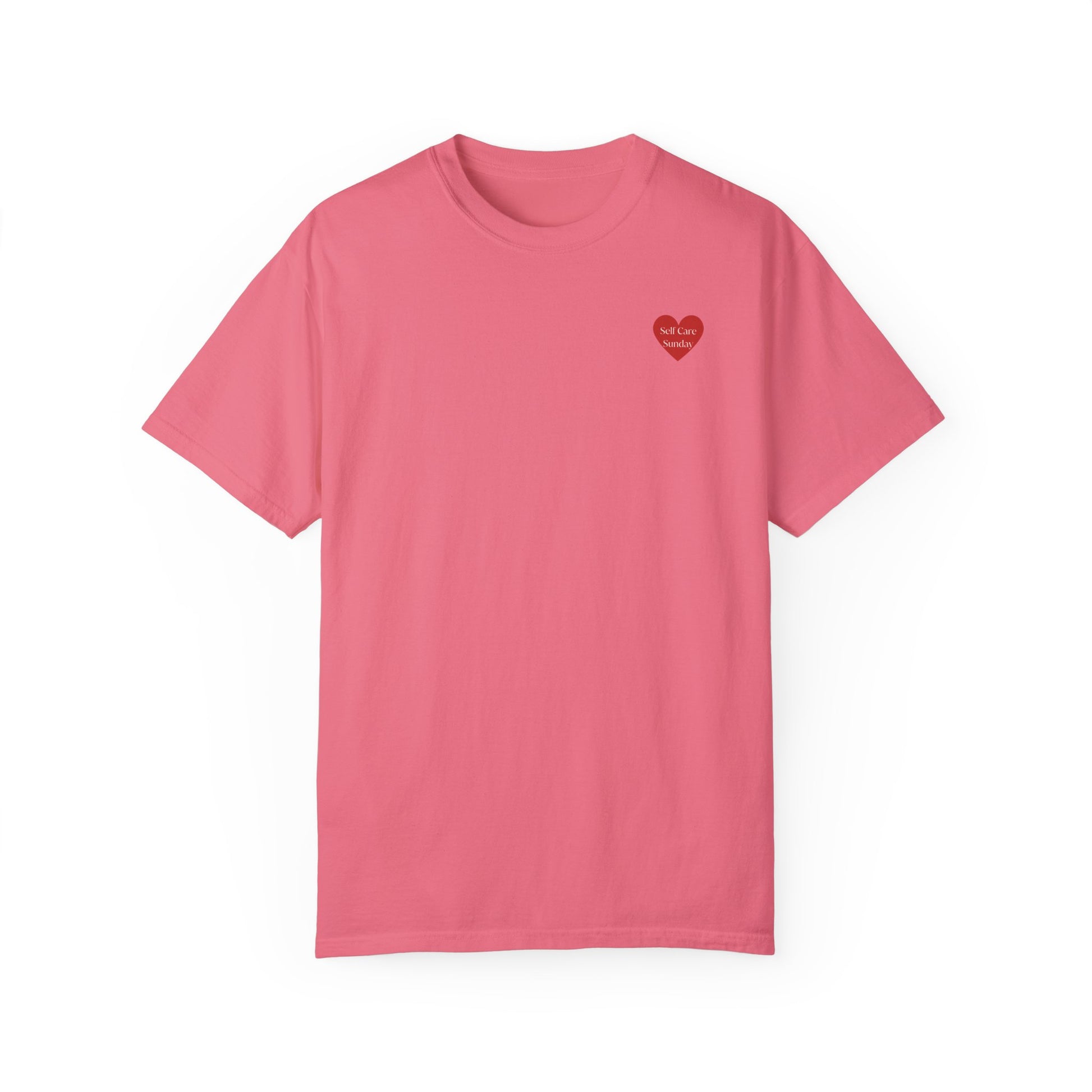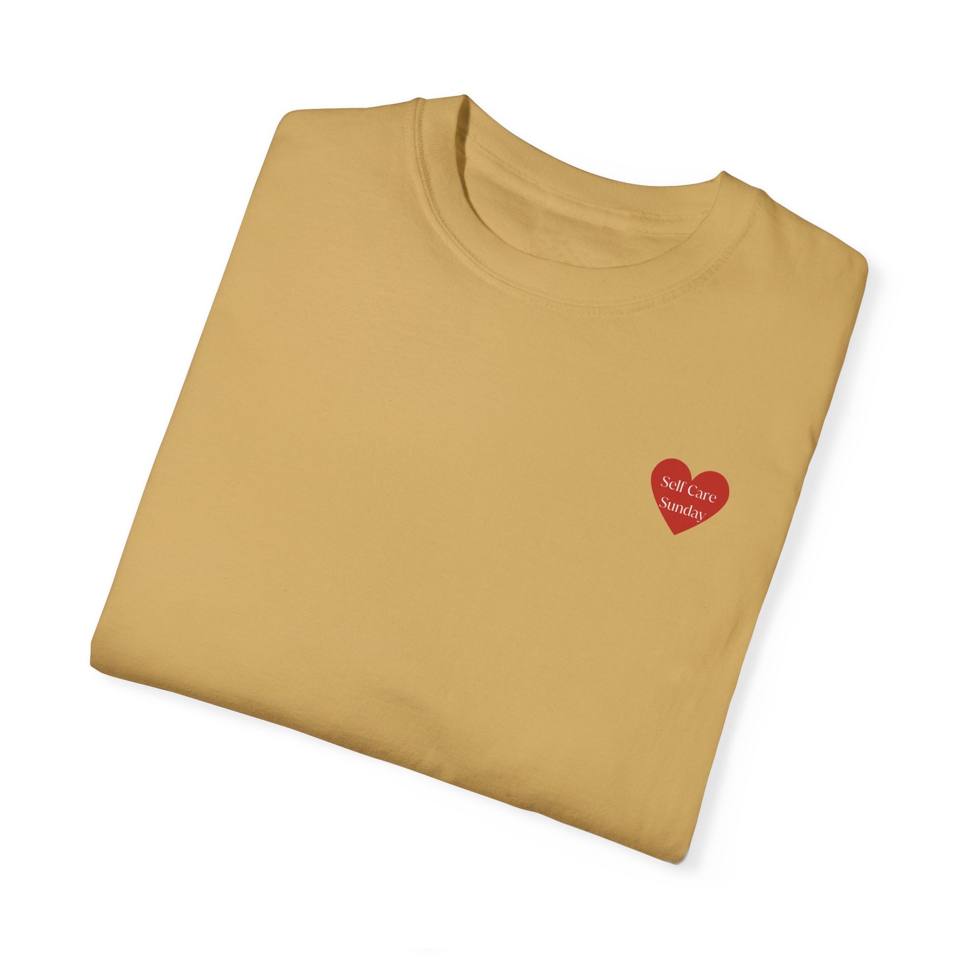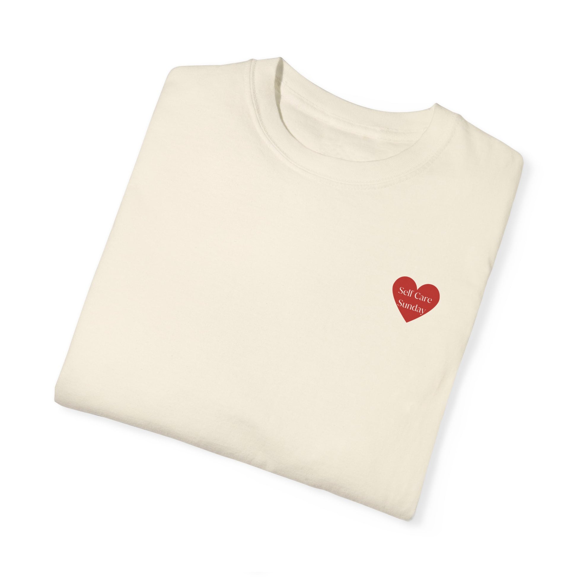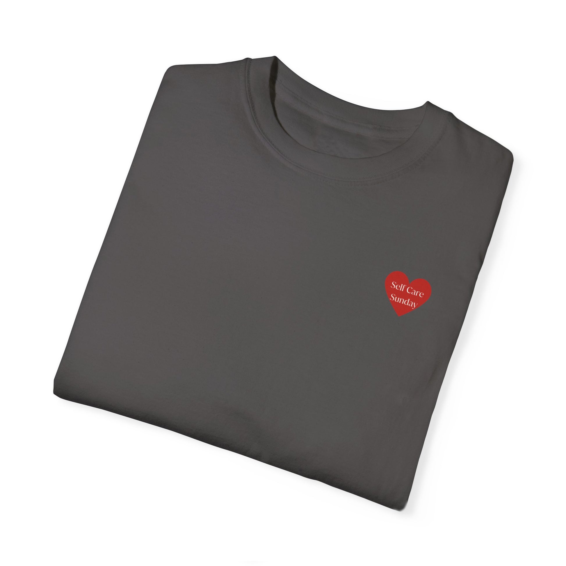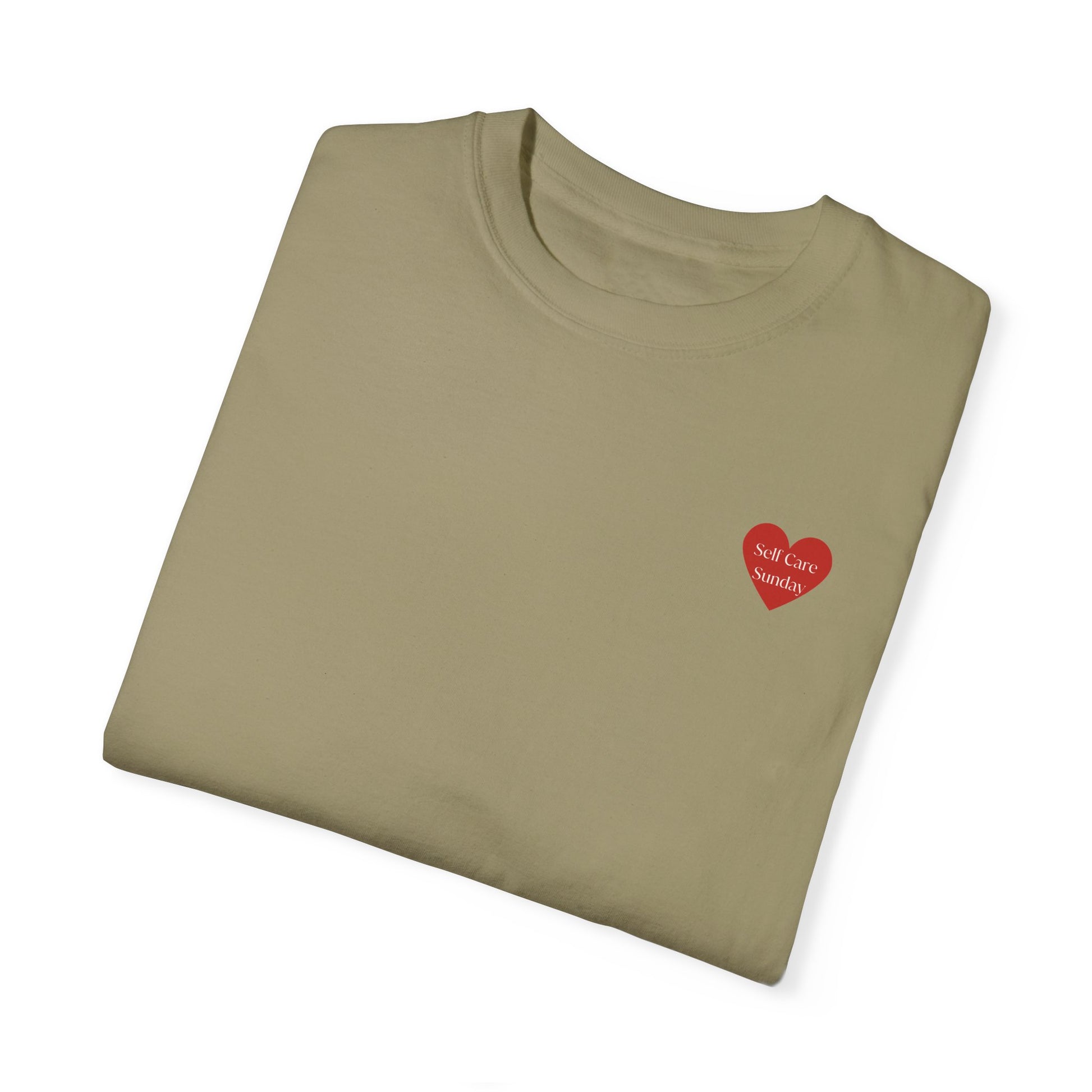 A self care sunday unisex t-shirt with a heart design, perfect for relaxing and unwinding. This comfortable tee is ideal for anyone looking to prioritize self-care in their daily routine. It's relevant for people who enjoy cozy, laid-back vibes and want to spread positivity through their outfit choices. Great for self-care Sundays, mental health awareness events, and casual outings with friends.
