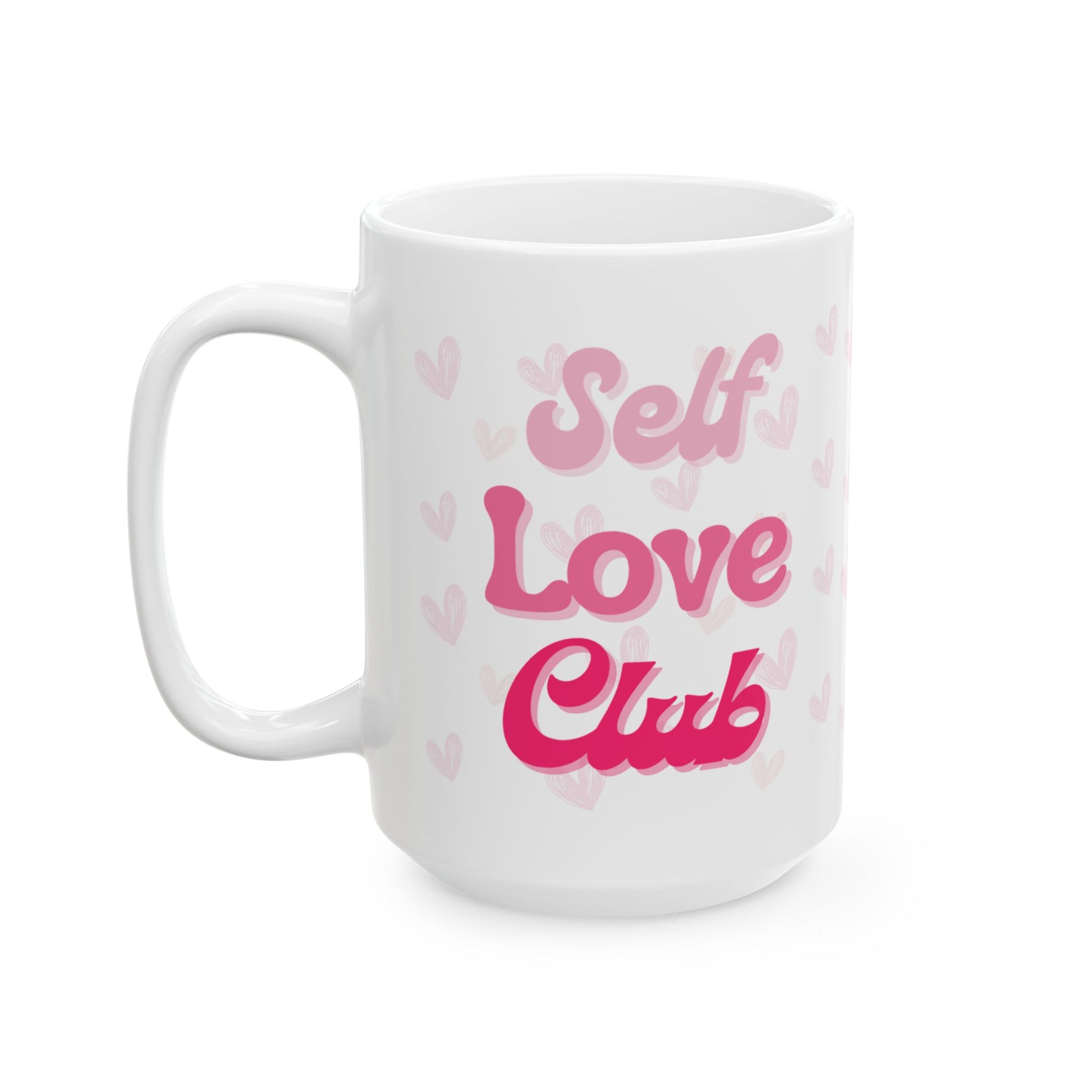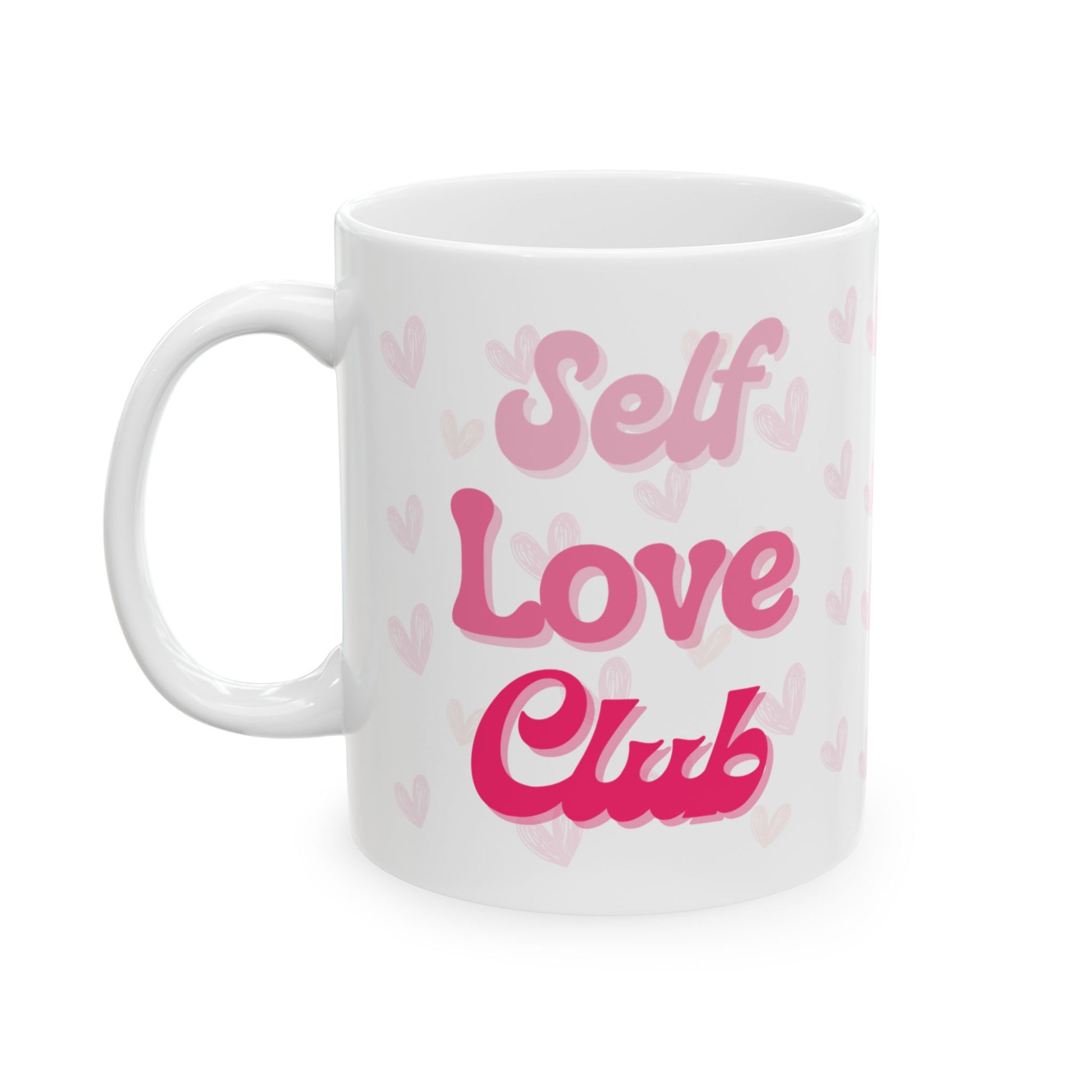 White ceramic mug featuring “Self Love Club” in fun text and pink scattered heart accents, perfect for starting your day with a positive message and a reminder to practice self-love. This mug is ideal for anyone looking to add a touch of positivity to their morning routine, making it a great gift for birthdays, Valentine's Day, or just because.